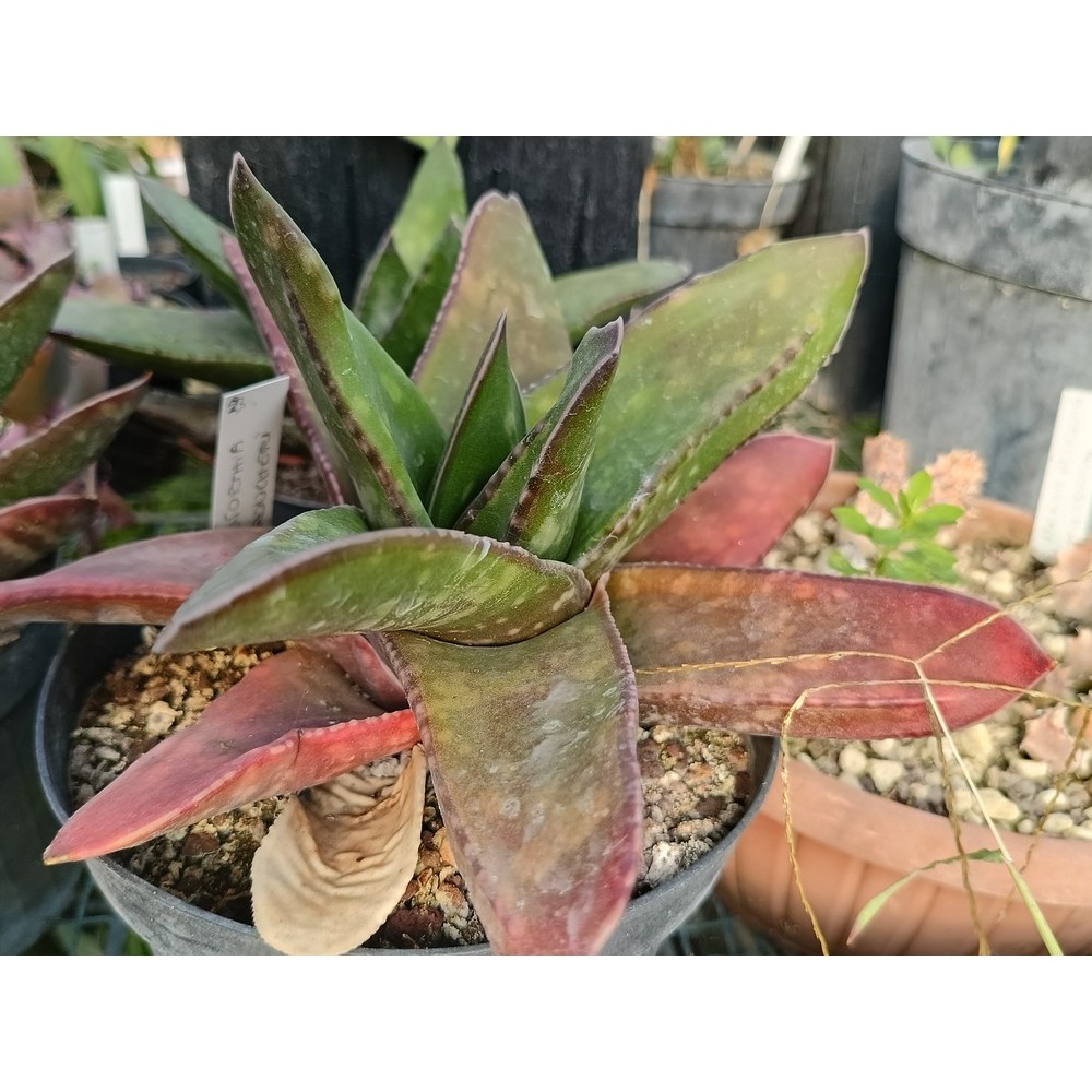 Leaves 20–30 cm long and 3–10 cm wide, elongated and triangular in cross-section, dark green with light green transverse bands, fan-shaped when young, then spiraling. Tubular red flowers with a subspherical base grow in long, branched inflorescences.