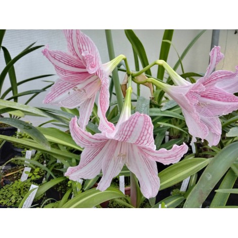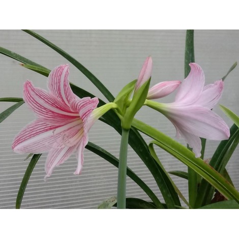 Ibrido orticolo. Foglie lunghe 30-40 cm per 3-4 cm di larghezza di colore verde scuro con una striscia bianca centrale longitudinale leggermente sfumata. Scapo fiorale portante 2-4 fiori campanulati di colore rosa. La pianta va in riposo vegetativo durante l'estate e ritorna in vegetazione tra la fine dell'estate e l'inizio dell'autunno per cui mantiene la vegetazione durante l'inverno. La fioritura avviene in genere in autunno o in inverno, alle volte in primavera. Necessita di un terreno ben drenato e di una posiizione ombreggiata. Annaffiare regolarmente durante il periodo vegetativo ma tenere asciutto (o quasi) durante l'estate. Non rustico. 1 bulbo del diametro di 2-3 cm.