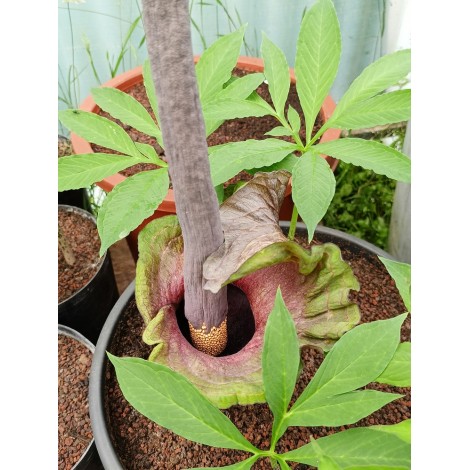 Specie tuberosa decicua in inverno. Il tubero, di forma discoidale, sviluppa un'unica grande foglia con picciolo lungo fino a 80 cm e lamina fogliare palmatosetta. Spata ampia con margine ondulato di colore bruno-rosso con base biancastra, rigonfia nella parte basale. Spadice molto lungo, rossastro. Specie nativa della Tanzania e del Malawi dove cresce sulle rocce nelle foreste fluviali fino a 500 m di altitudine. Necessita di un terreno ben drenato e di una posizione ombreggiata. Questa specie va in riposo vegetativo durante l'inverno, per cui in questo periodo deve essere lasciata asciutta e posta in un luogo relativamente caldo (sopra i 7°C). Durante il periodo vegetativo invece annaffiare regolarmente. Non rustica. Tubero di 3 cm.