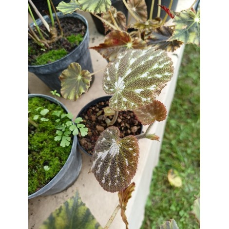 Begonia strisciante con foglie molto appariscenti. Questa specie, piuttosto rara in coltivazione, è molto apprezzata per le belle foglie sub-rotondeggianti, rugose ma vellutate, di colore verde scuro con vanature più chiare e intense macchie bianco perla. Fiori bianchi, più lunghi delle foglie, in primavera. Questa specie cresce spontanea nelle foreste del Messico e del sud America, prediligendo zone rocciose o tronchi d'albero in zone molto ombrose con umidità elevata. Necessita quindi di una pozione in ombra e di un terriccio ben dranato. Annaffiare regolarmente in estate ma diradare le annaffiature in inverno. Non rustica.