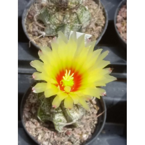 Cactus globoso, non accestente, tendente ad allungarsi con l'età. Fusti a 8 coste con epidermide più o meno densamente ricoperta da piccole scaglie bianche. Le areole sono disposte lungo le coste da cui si sviluppano lunghe, piatte e contorte spine brunastre, poco pungenti. Fiori del diametro di 7,5 cm, gialli con base rossa, molto appariscenti. Specie nativa del Messico settentrionale (Coahuila), diffuso nel deserto di Chihuahua. Facile da coltivare, necessita di un terreno ben drenato e di una posizione soleggiata o in mezz'ombra. Annaffiare ogni 10-15 giorni in estate, mai in inverno. Non rustica. Pianta a radice nuda.