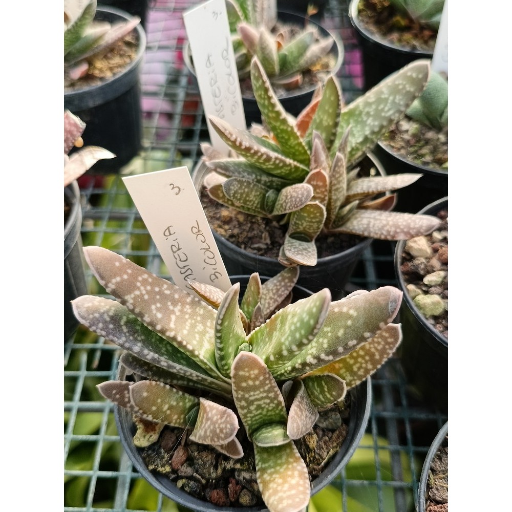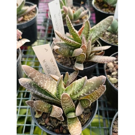 Foglie carnose, disposte a ventaglio negli esemplari giovani, poi spiralate, di colore verde scuro densamente maculate di bianco.