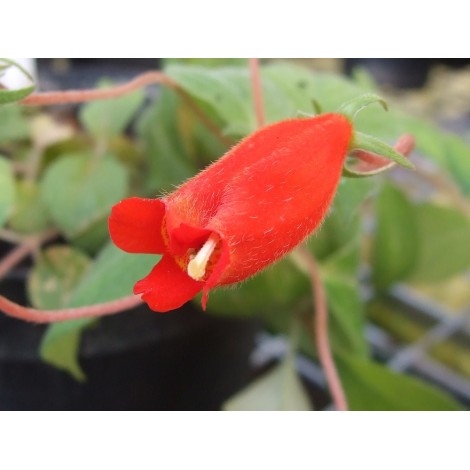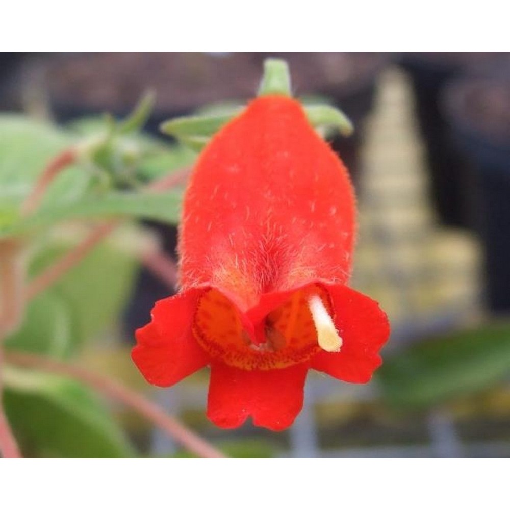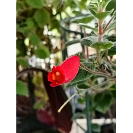 Specie rizomatosa con piccoli rizomi cilindrici biancastri, scagliosi. Fusti erbacei poco ramificati, rossastri. Foglie ovato-lanceolate co venature in evidenza. Fiori tubualri, semi-penduli, rossi esternamente, gialli internamente con puntini rossi e 4 lobi apicali rossi. La fioritura avviene in estate-autunno. La pianta va in riposo vegetativo in autunno perdendo completamente la parte aerea. I rizomi dormienti vanno lasciati nel vaso e posti in un luogo dove non geli annaffiandoli solo una volta al mese. Durante la stagione vegetativa invece le annaffiature devono essere regolari evitando stress idrici. Terrenno leggermente drenato ma ricco di humus e posizione ombreggiata. La specie tipo è nativa della Bolivia e cresce nelle foreste, maggiormente ai margini delle cascate. Non rustica. 6 rizomi o pianta in vaso di 14 cm di diametro.