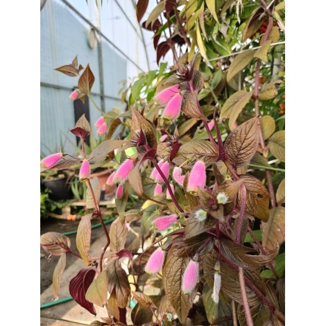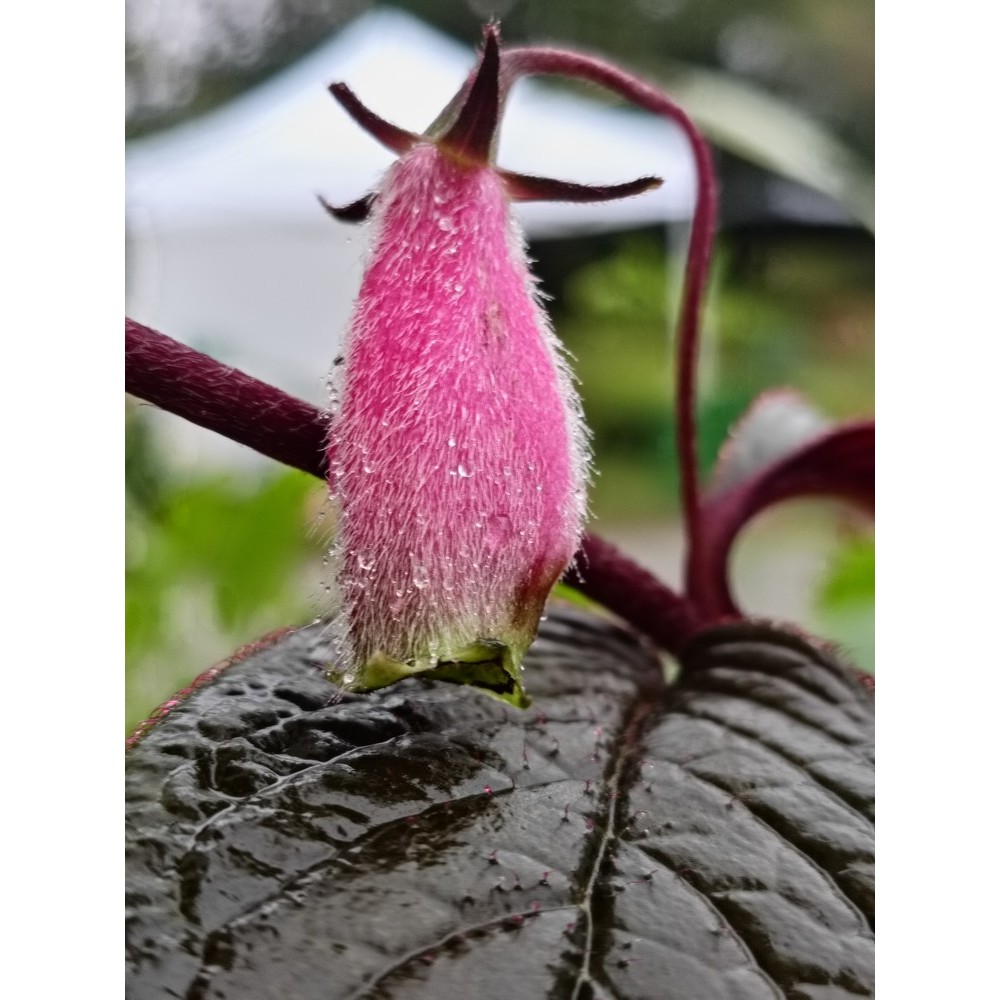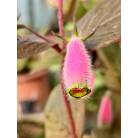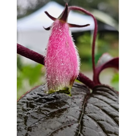 Specie rizomatosa a riposo invernale. Rizomi cilindrici, squamosi, biancastri. Fusti lughi fino a 1 m, eretti o semipenduli, coperti da una densa peluria violacea. Foglie ovato-lanceolate, dentelallate sul margine, di colore porpora intenso, pubescenti sulla pagina inferiore. Fiori semi-penduli, rigonfi, pelosi, di colore rosa con lobi verdi striati di nero. La specie è nativa delle foreste umide della Guyana, del Perù, della Bolivia e del Brasile. Le piogge in natura sono stagionali e si concentrano nei mesi estivi per cui in inverno la specie va in riposo vegetativo seccando la parte aerea. Prediliga quindi annaffiature regolari e abbondanti in estate ma scarse in inverno (basta una volta al mese). Posizione ombreggiata e terreno leggermente drenato. Pianta in vaso di 16 cm.