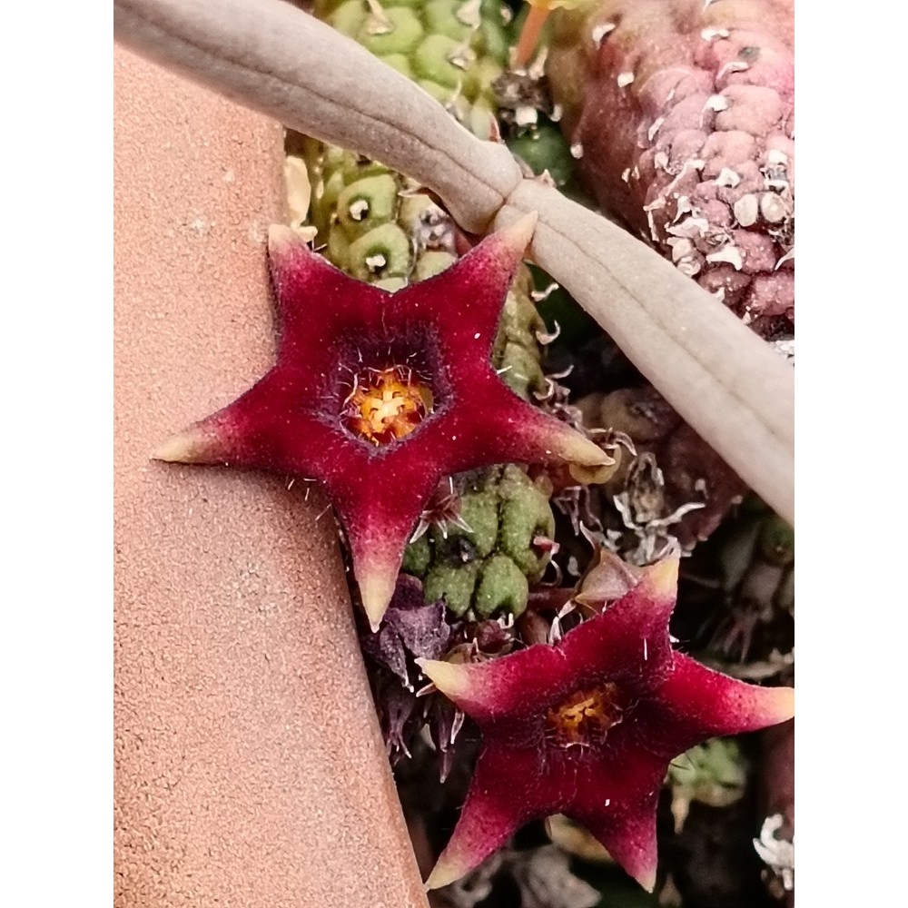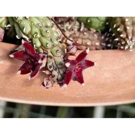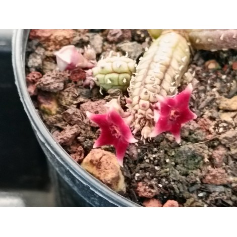 Presenta fusti striscianti, anche sotterranei, di colore rosso, molto tubercolati. Fiori piccoli singoli o in gruppi di 2 o 3, semi-apicali, a forma di stella, ben aperti e di colore rosso scuro con punte bianche. Molto fiorifera.