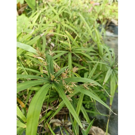 Marsh rhizomatous species 25 to 80 cm high. Triangular section culms bearing a tuft of linear-lanceolate, glossy leaves at the apex. The culms are produced continuously and make the head very dense. Found in wetlands and along rivers in forests, valleys, grasslands, mountain slopes, footpaths and rice paddies between 100 and 1700 m in much of Asia, northeastern Australia and islands of the Pacific and Indian Oceans. It prefers moist or semi-submerged soils and is also suitable for ponds. Hardy. 1 potted plant 16cm.