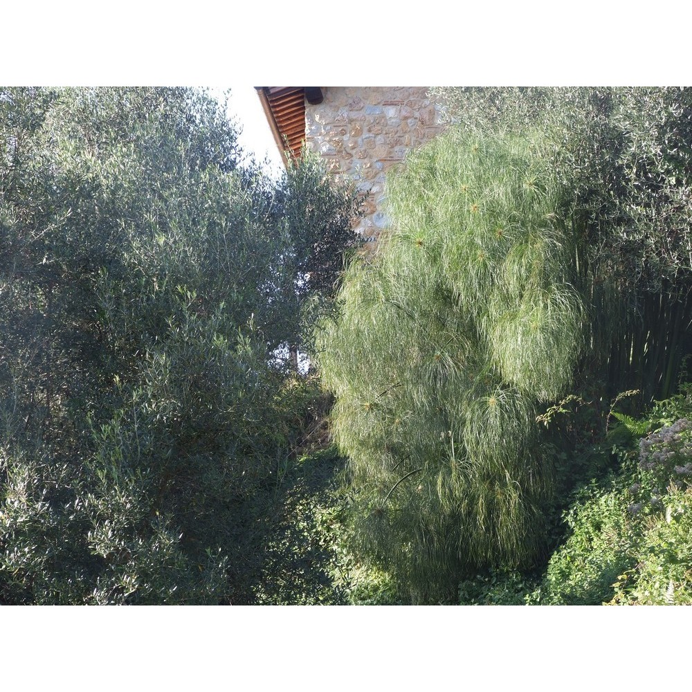 Il papiro egiziano cresce spontaneo nelle zone umide dell'Africa e nel nord di Israele. Specie rizomatosa, è dotata di un rizoma strisciante che tende a ramificarsi. Dal rizoma si originano i fusti a sezione triangolare lunghi da 2 a 5 m. All'apice dei fusti si trova un ciuffo di brattee filiformi disposte a ombrello. La pianta ha bisogno di acqua tutto l'anno per svilupparsi bene, ma mal sopporta il gelo. Può sopportare qualche sporadica gelata perdendo la parte aerea che ricaccerà in primavera. Posizione soleggiata o in mezz'ombra. Vaso 16 cm.
