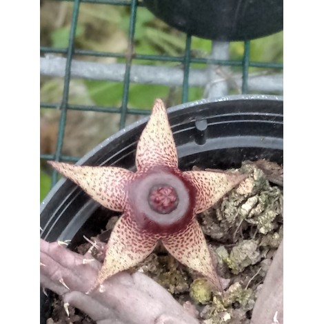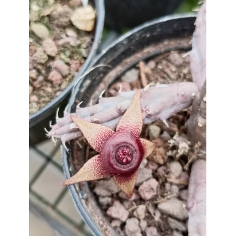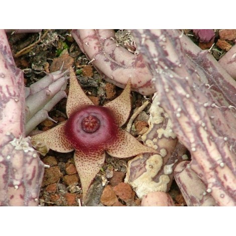 Fusti striscianti a sezione sub-circolare, di colore verde-grigio chaizzati di rosso. Fiori a stella di circa 3 cm di diametro, con lobi color avorio macchiati di rosso e annulus rialzato, lucido, di colore rosso scuro. Cresce velocemente e fiorisce facilmente. Terreno ben drenato e posizione semi-ombreggiata. Annaffiare ogni 10-15 giorni in estate, mai in inverno. Non rustica. Piantina leggermente ramificata a radice nuda.