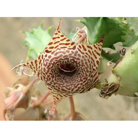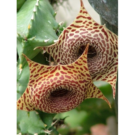 Ibrido di Hurnia zebrina con fusti corti e tozzi a quattro coste, leggermete dentati. Fiori grandi (4-5 cm), gialli con fini maculature rosse e annulus rialzato dello stesso colore, papilloso internamente. Terreno ben drenato e posizione semi-ombreggiata. Annaffiare ogni 10-15 giorni in estate, asciutto in inverno. Non rustica. Piantina con fusto singolo o leggermente ramificato a radice nuda.