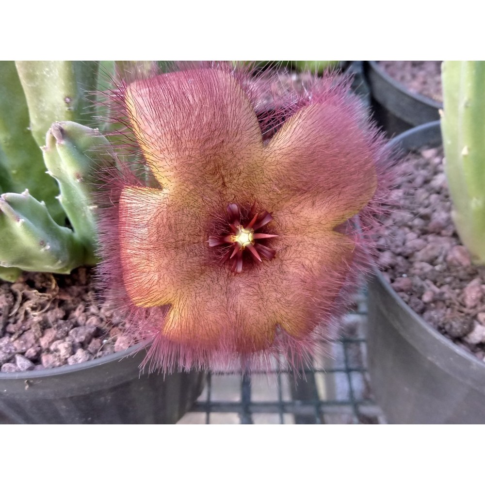 Succulenta cespitosa a crescita estiva. Ibrido orticolo caratterizzato da fusti pubescenti e accestenti alti fino a 10 cm, a sezione più o meno quadrangolare. Fiori a stella del diametro, più o meno, di 10 cm, coperti da una peluria rossastra o biancastra. Necessita di una posizione semi-ombreggiata e di un terriccio ben drenato. Annaffiare ogni 10-20 giorni da marzo a ottobre ma lasciare completamente asciutta in inverno. Non rustica. Talea, pianta a radice nuda o pianta in vaso.