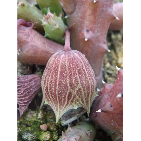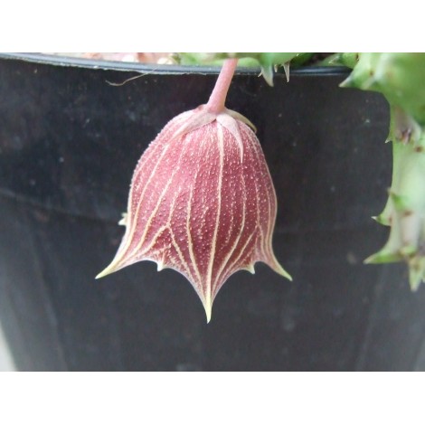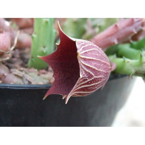 Fusti lunghi fino a 18 cm, di colore verde-rossastro, con tubercoli ben distinti ed appuntiti. I fiori compaiono alla base dei fusti dell'anno: sono campanulati, di colore rosso-porpora scuro, con tre nervature in evidenza sulla parte esterna dei lobi e lieve odore di carogna.