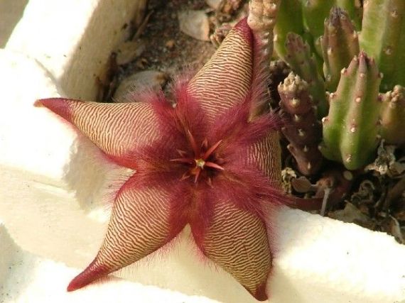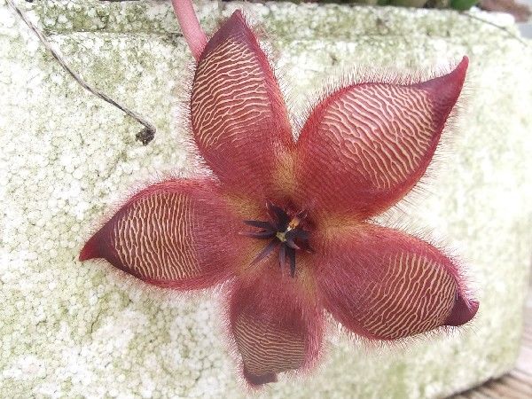 Fusto vellutato, eretto, a quattro coste con denti molto piccoli. Fiori del diametro di circa 5 cm di colore rosso con striscie trasversali bianche sui lobi e peli rossi sui margini e al centro. Mezz’ombra. Sud Africa (Capo Occidentale).